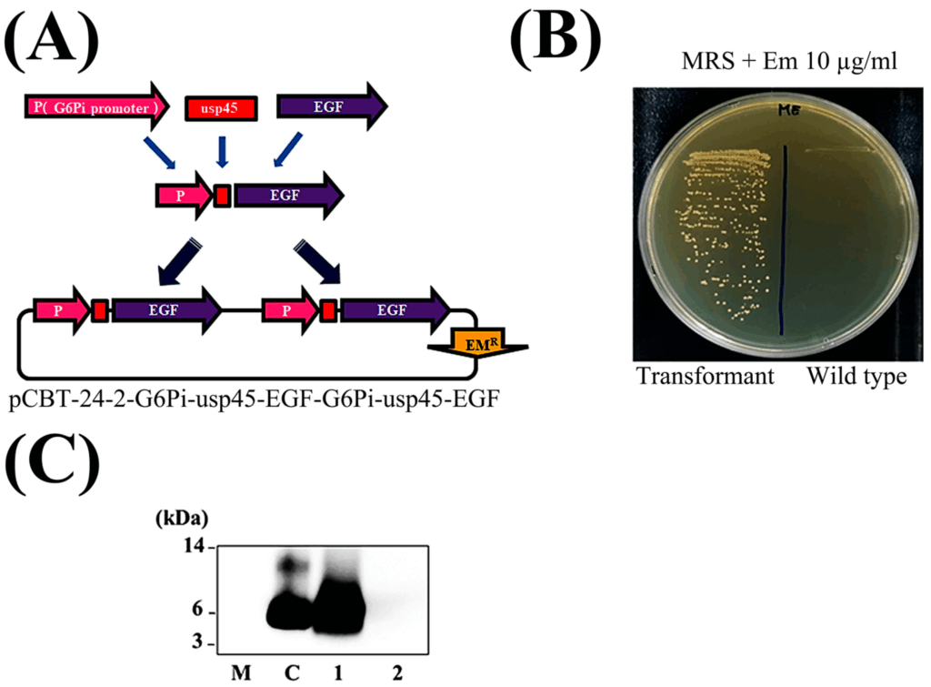 The image above illustrates Construction and Detection of EGF in Probiotic System: (A) Engineered plasmid with EGF gene and secretion system. (B) Transformation of Pediococcus pentosaceus SL4 confirmed on agar. (C) EGF protein detected in culture supernatant via Western blotting.