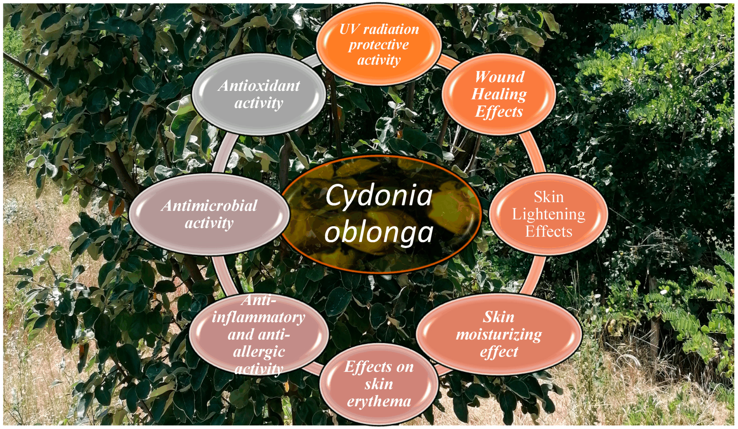 Cydonia oblonga Mill. (CO), commonly known as quince, is an ancient fruit-bearing tree with origins in Asia Minor, cultivated since 200 BCE by early civilizations. It has been recognized for its diverse applications in medicinal, nutritional, and ornamental contexts, with extensive traditional uses and a rich phytochemical composition. While existing pharmacological reviews have touched upon the phytochemical and ethnomedicinal aspects of CO, a unique focus on its dermatological relevance—particularly its topical and cosmetic applications—has been less explored. Therefore, Cydonia oblonga represents a compelling natural candidate, warranting a comprehensive examination of its potential in dermatological and cosmetic applications.