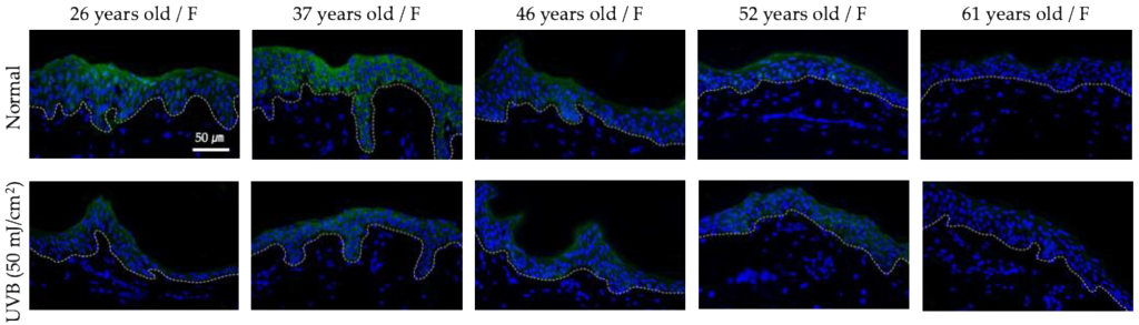 In the figure: Age-dependent decrease in Hsp47 protein in photo-protected tissue (abdomen) obtained from normal human skin (NativeSkin®, Genoskin S.A.S, Toulouse, France). Immunohistochemical staining demonstrated pronounced immunoreactivity in the upper granular layer, which decreased in intensity with advancing age (upper panel). UVB irradiation further reduced Hsp47 expression in the same tissue (lower panel). Green: Hsp47, blue: DAPI, dotted line: dermal–epidermal junction [magnification: ×400].