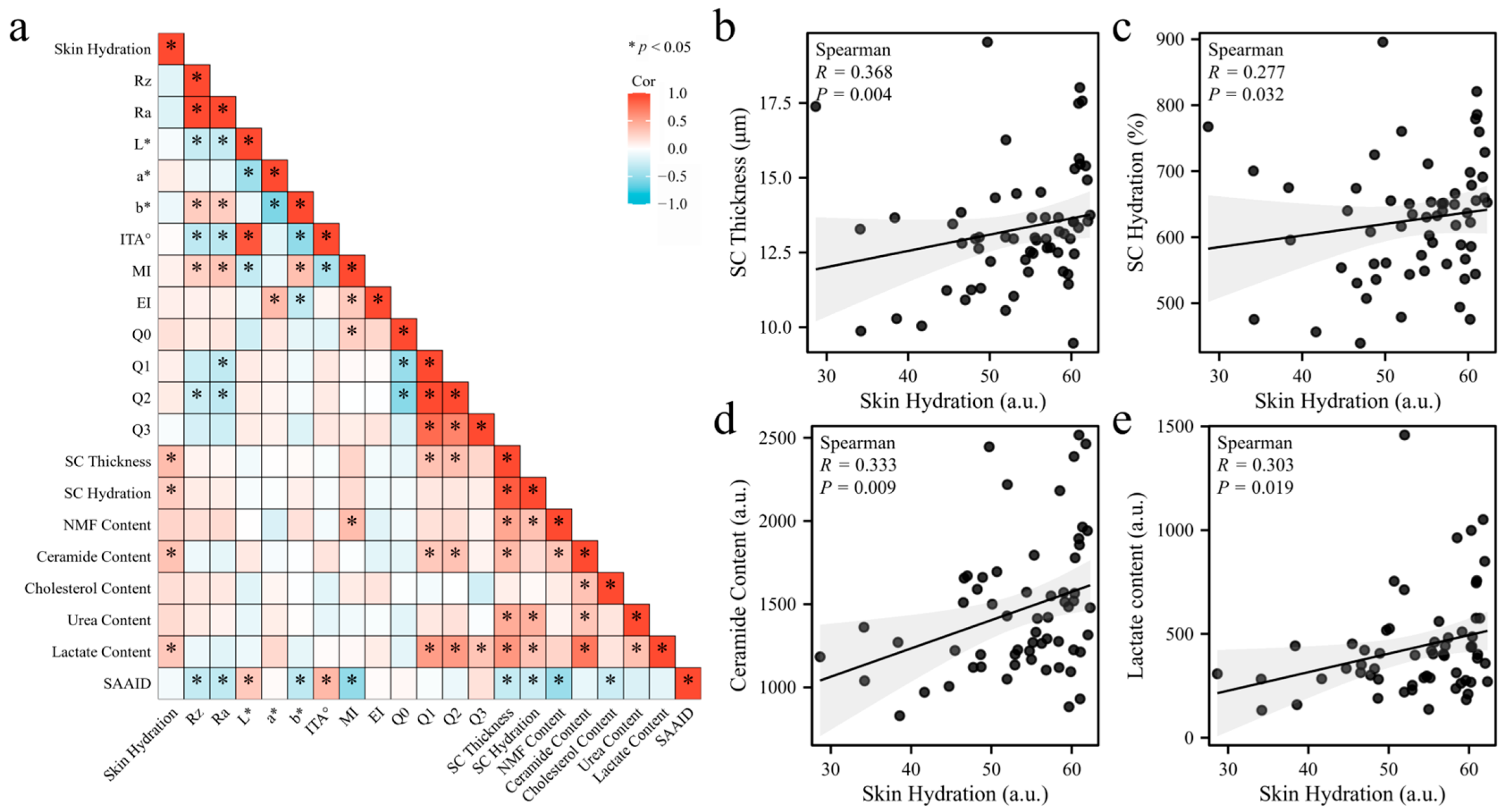 Correlations between various facial skin parameters and skin hydration. (a) Heatmap illustrating the correlation matrix of different skin parameters. Data with p < 0.05 are marked with an asterisk (*). On the heat map, red indicates a strong positive correlation, blue represents a strong negative correlation, and white indicates no correlation. (b–e) Scatter plots depicting the correlation between skin hydration and SC thickness (b), SC hydration (c), ceramide content (d), and lactate content (e). EI (erythema index), MI (melanin index), a* (represents red and green shades), b* (represents blue and yellow shades), ITA° (individual typology angle), L* (indicates color brightness), Q0 (maximum recovery area), Q1 (gross elasticity), Q2 (net elasticity), Q3 (biological elasticity), Rz (average maximum roughness), and Ra (arithmetic mean roughness).
