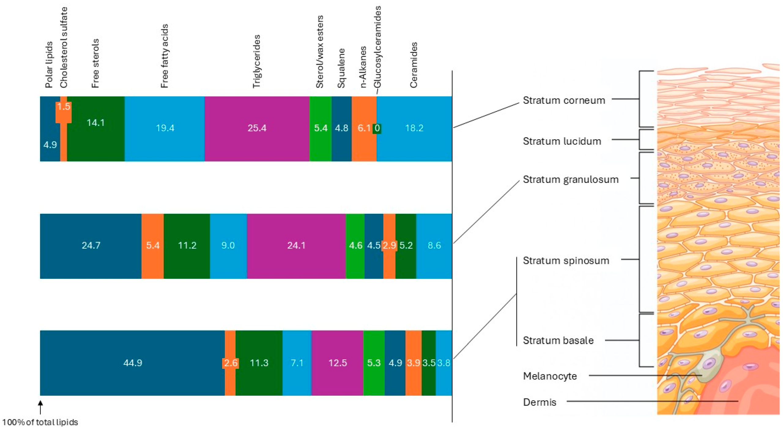 In the image below: The schematic on the right shows the main layers of the human epidermis and dermis. The stacked horizontal bars on the left represent the relative abundance (% of total lipids) of major lipid classes among different epidermal layers: stratum corneum (top bar), stratum granulosum (middle bar), and stratum basale-spinosum (bottom bar). Colors indicate lipid classes as labelled above the top bar (from left to right): polar lipids, cholesterol sulfate, free sterols, free fatty acids, triglycerides, sterol/wax esters, squalene, n-alkanes, glucosylceramides, and ceramides; numbers inside the bars give the percentage contribution of each class. Lipid composition data are adapted, and the epidermal morphology from an open-access teaching resource (Lumen Learning).