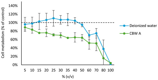 In the image: Effect of CBW A on HaCaT cell metabolism. HaCaT human keratinocytes were treated for 24 h with increasing concentrations of deionized water or CBW A. Cell metabolic activity was assessed using the resazurin assay. Data are presented as mean ± SEM from at least three independent experiments and expressed as % of untreated control. The dashed horizontal line represents 100% viability of the untreated control.