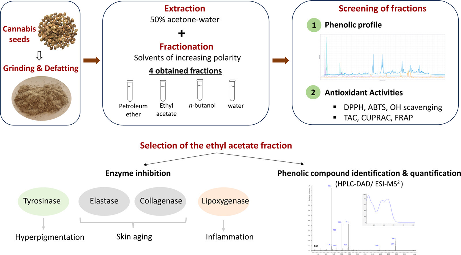 Defatted cannabis seeds were extracted using a 50% acetone-water mixture and then sequentially fractionated with petroleum ether, ethyl acetate (EA), and n-butanol to separate compounds by polarity. The EA fraction, identified as the most antioxidant-rich, underwent phenolic profiling via HPLC-DAD/ESI-MS² to identify and quantify its constituents. Finally, the fraction was tested through spectrophotometric assays to determine its inhibitory effects (IC50 values) against elastase, collagenase, lipoxygenase, and tyrosinase enzymes.
